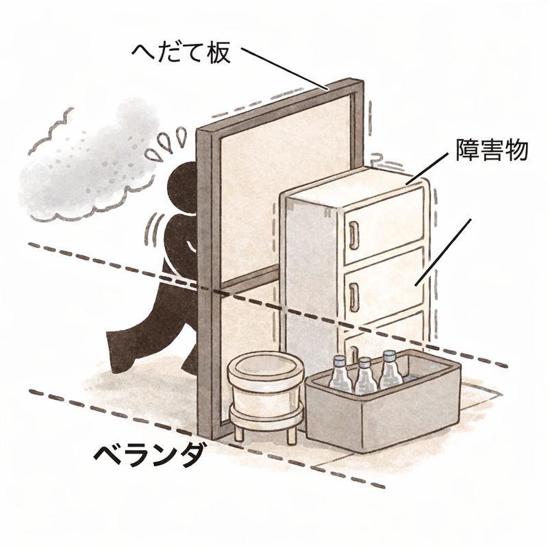 ● ベランダは大切な避難路です。へだて板、避難ハッチの近くには、障害となるものは置かず、普段から整理しておいてください。