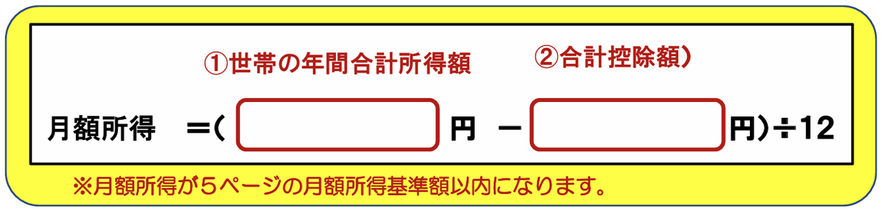 ⚫ 申込みの基準となる世帯の月収額の計算方法は、まず1年間の世帯員全員の総所得金額を計算して、そこからあてはまる控除額をすべて差し引いた残りの金額を12で割ったものです。